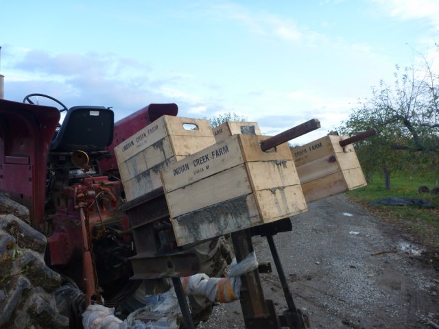 We have another tool, the tree digger, that we use in the nursery. It is kind of clever. Each year we have to dig up thousands of young fruit trees so they can be replanted in orchards and parks. We drive the High-Boy tractor over long rows of trees, bending the trunks but not snapping them, and the digger gently dislodges the trees. Then we collect them by hand, bundle them up, and toss them into the pickup. Beats the old shovel technique, one tree at a time.