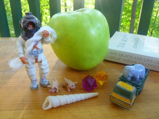 The giant Mutsu apple famously appears in this postmodern still life by the artist Lila McBalto. The plastic diver holds real strands from a Japanese silkworm. The many-sided dice were used in a vintage fantasy game called “Dungeons & Dragons,” circa 1982. The piglets aren’t real.