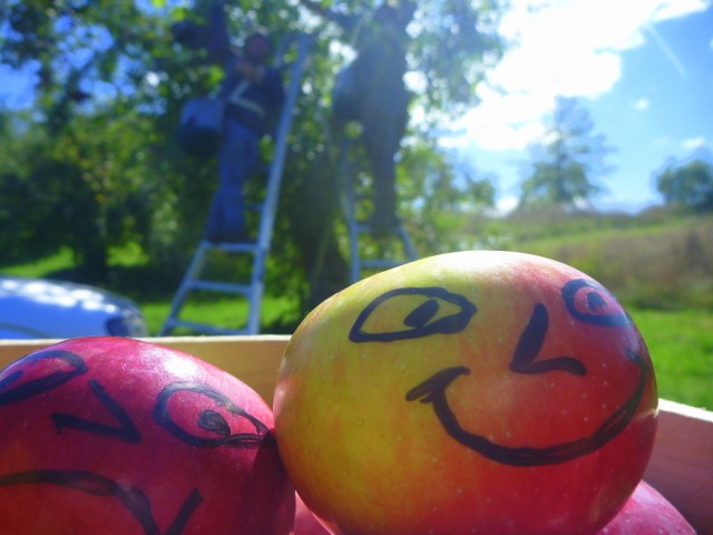 TUG OF WAR — The apple gang has been running teamwork drills all week, such as the delicate Duck-Wince-Crimp maneuver shown here. Takes a lot of trust, and look at the guns on that old farmer! He’s tougher than a one-eared alley cat. How will Team Pig stand a chance? Sorry, Piggery, sometimes you are the windshield and sometimes you are the bug.