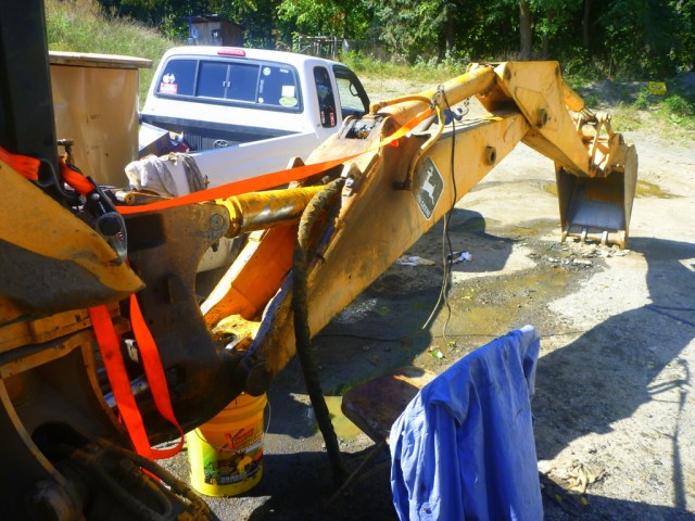 BACKHOE IS BACK — It was a long few weeks without the backhoe’s hoe. Stitched her up yesterday, just in time to dig a huge pit of rotten apples and tomatoes for the tug of war! Team Pig will feel right at home when they nosedive in THAT.