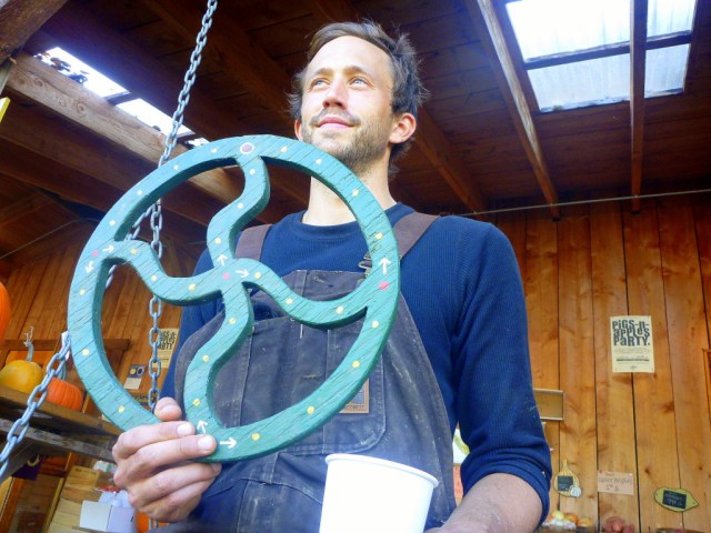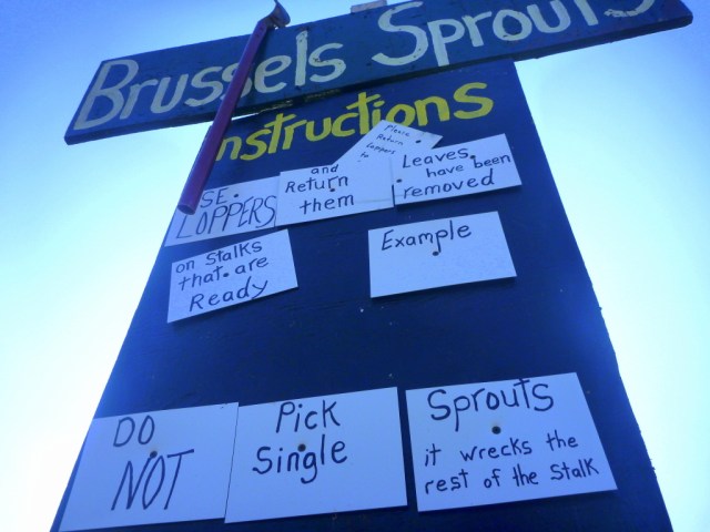 Next to the pumpkin patch is a knee-high forest of Brussels sprouts. They are just waiting to be lopped. The loppers are supposedly hanging on this sign. It is magnetic poetry, farm-style: all the pieces are screwed in.