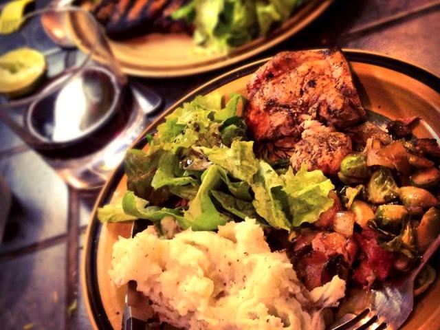 And now a quick break for beautiful pictures from a customer, Charles E. He sent this mouth-watering shot of last night’s dinner — Brussels sprouts from Indian Creek Farm and goodies from other farms around town. Inspiring!