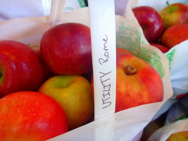 Big sale on “utility” apples. They have a few birth marks or life scars. People are like, “Eww, a birth mark or life scar,” so these apples get downgraded to the utility bin. These are not airbrushed Hollywood apples, they are real apples for baking, saucing, and eating. Only $4 for a 5-pound bag and $6 a peck!