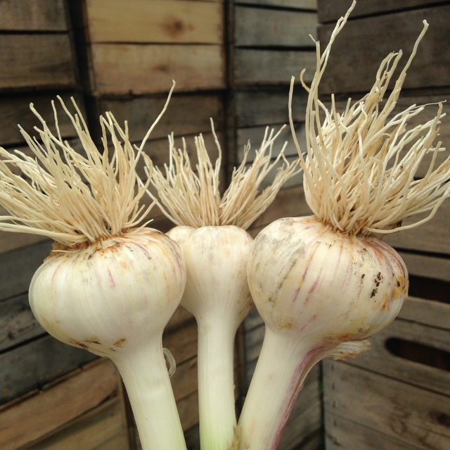 Your Sunday Garlic Party Host – Greg has been tending the crop to get ready for the big day. Here he is after picking the first hundred heads for next year’s seed and biking it down to beat the storm. It will hang from the rafters of the barn where it gets good air flow from the wind but is safely out of the rain! Thus the cure will cure. Greg will teach free classes on Sunday including Garlic Growing and Storage 101 (11 AM), Kids Pesto Making (1 PM), and Medicinal Effects of Garlic (4 PM). See the Facebook event listing, Ithaca Events listing.