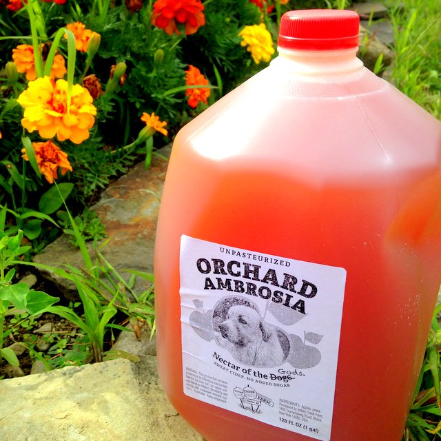 First apple cider of the year! We will press the first batch on Friday so you can get it in gallons and half-gallons on the weekend and probably Friday afternoon if the crew has a good morning. This is “Orchard Ambrosia,” nectar of the OMGawds – our locally somewhat famous unpasteurized beverage containing only fruit. No added sugar. We squeeeeze fruit with water pressure and out drips ‘Brosia.