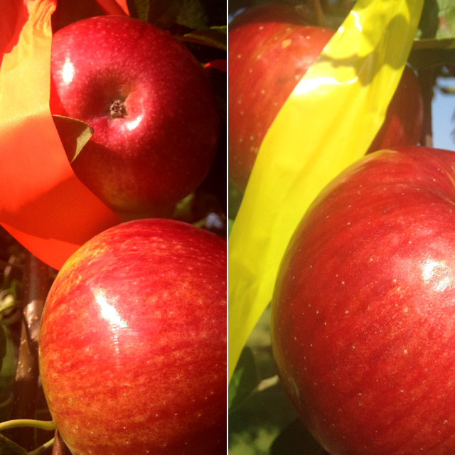 Do you have a Vintage heart? You have seen too many hard times to count, just like the Macs and Cortlands on the century-old trees in our Vintage Orchard. But you are reliable and cold hardy. You see people reaching for the handsome Johnnies Come Lately – cough cough Honeycrisp – but you humbly truck on doing good work. You trust that someone will remember that you are the backbone of brilliant ciders with a proud history back to the 1820s (Mac), or you are the bright white of fruit salads going back to 1898 (Cortland). You are a great North American apple-heart and worthy of the truest love. Orange ribbons (Mac) and yellow ribbons (Cortland) in Vintage Orchard.