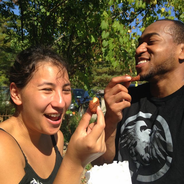 Bravo, you’ve picked all the pears. Speaking of pears, this pair is doing an exemplary job. Jessi Hersh and Stephan Herard, our donut models of the week, are demonstrating the bite-size nature of the donuts. We received two Facebook complaints, out of thousands of donut lovers served, that these should be marketed as donut HOLES. Problem is, these would-be donut holes have holes IN THEM. So you see our reluctance to create a new class of topological object, a hole with a hole. Way above our math certification. Served Saturday and Sunday 10 AM to 6 PM.