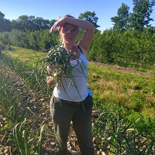 Pick garlic scapes! You can save the date for the Big Garlic Harvest Party (Saturday July 28) but meanwhile you can pick your own scapes for stirfry and pesto and snacks.