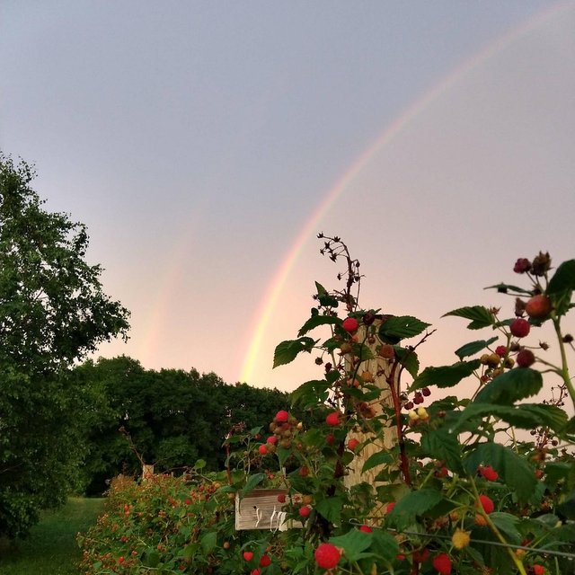 Yes, razz is the name of the game. The Strawberry Moon was followed posthaste by the Raspberry Rainbow, captured here over the razz patch by our own Farmer Ly (“Lee”). You can pick raspberries in the main patch — see the map on the new 2018 brochure – or along the fenceline which is not shown on the map for national security reasons.