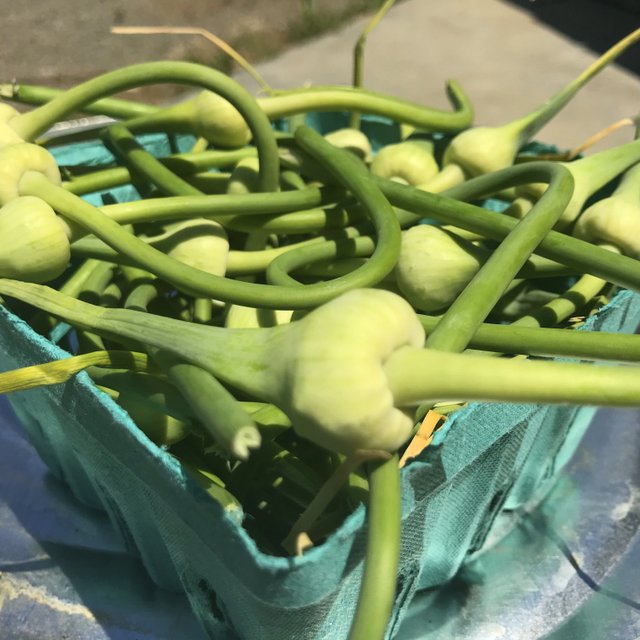 Scapes. Greg’s garlic scapes make exceptional pesto as well as stir fry accoutrements.