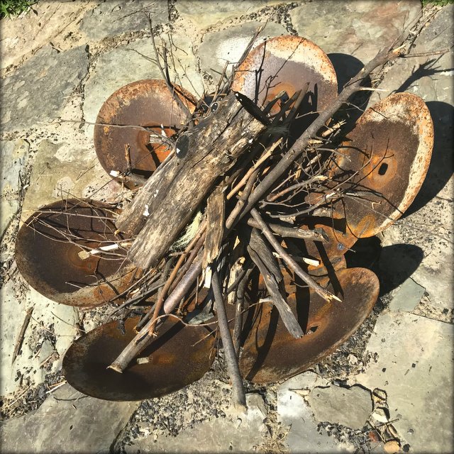 This more modest contraption was cobbled together farm-style from old “plow” parts. More properly called a disc harrow, but plow is fine for you city types. It’s a fire pit. Up at the ‘Henge. You can see photos of the DIY job here.