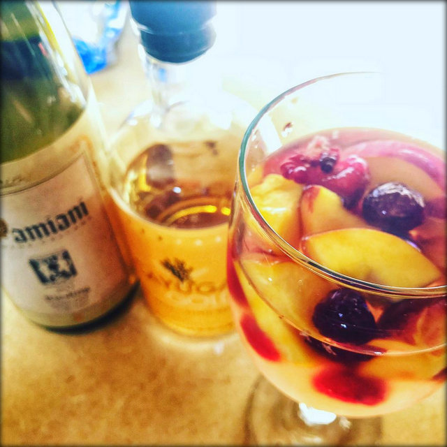 Wash it all down with peach raspberry sangria. Thank you to @4lettersfood for the photo featuring local flavorites @damianiwinecellars and @myerfarmdistillers and peaches and raspberries from The ‘Creek. Go Finger Lakes!