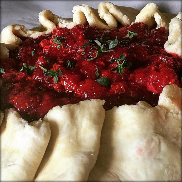 Fresh raspberry galette with lemon thyme! You can scrounge for the last summer raspberries now. Could be a fall crop in September, but last chance for the current batch. Photo by @dolcedelightithaca. Thank you, Dolce!
