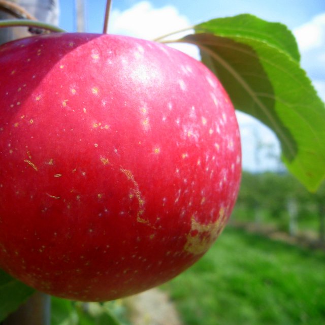 Pick Sansa apples. Row 10 of the Dwarf Orchard. A cross between the Akane and Gala varieties, developed in the 1970s as a collaboration between Japan and New Zealand. Sweet and acidic.