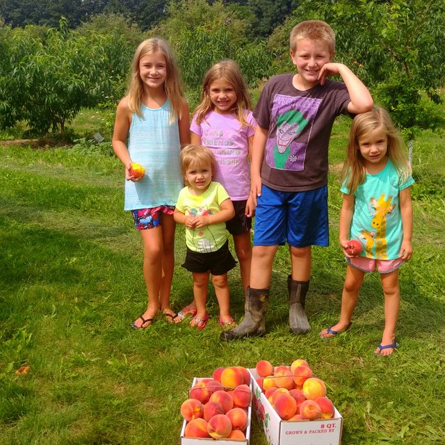 Space Team Five is in charge of peach picking! This gang of 5 recruits picked 2 pecks in like a minute and made cobbler, crisp, and freezer bags of chopped peaches. Thanks to Jenna for the family photo. Come pick peaches – this is the final week of heavy peach picking action. Crowds will demolish the orchards forthwith.