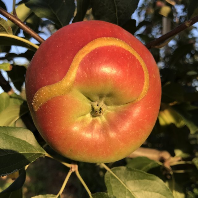 Pick apples in the Dwarf Orchard. Autumn Crisp (called NYS 674 on our signage), plus Dayton, Elstar, Jonamac. All great apples. This postmodern apple design was courtesy of the European Apple Sawfly. It’s so Euro and pretentious. But perfectly good eating. The swirly part tastes good. Pick apples now, ask at the stand for the row map.