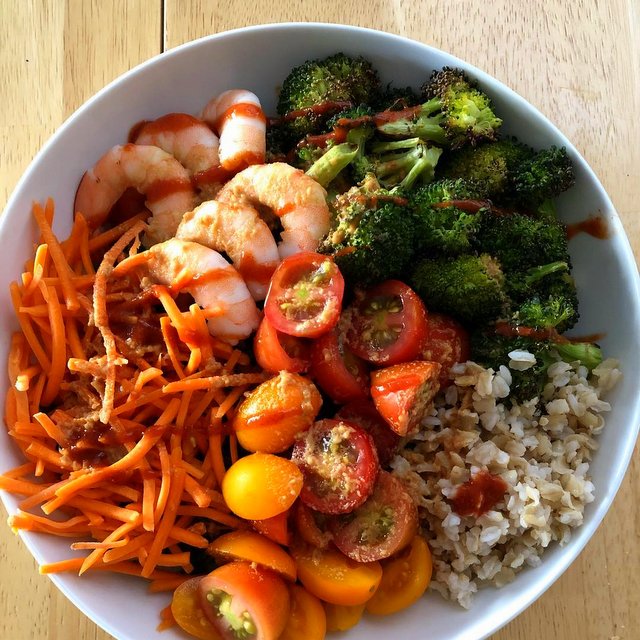 Fresh tomatoes make stuff scrumchy. Kale with lemon juice, shrimp, cherry tomatoes, brown rice, shredded carrots, roasted broccoli, sesame oil, and homemade peanut-lime dressing. Dish of the week by @dishes_n_degrees. Biscuit = Meal in a bowl will make you feel whole.