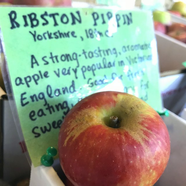 Bountiful and exotic heritage apples at the farm stand. Happy 310th birthday, Ribston Pippin. “This apple was grown in 1708 from one of three apple pips sent from Normandy to Sir Henry Goodricke of Ribston Hall at Little Ribston near Knaresborough, Yorkshire; the original trunk did not die until 1835. It then sent up a new shoot and, on the same root, lived until 1928. Ribston Pippin is one of the possible parents of Cox’s Orange Pippin.” (From Wikipedia which is always correct about everything.) Biscuit = A ‘pip’ is what people over there call seeds. Sooooo weird!