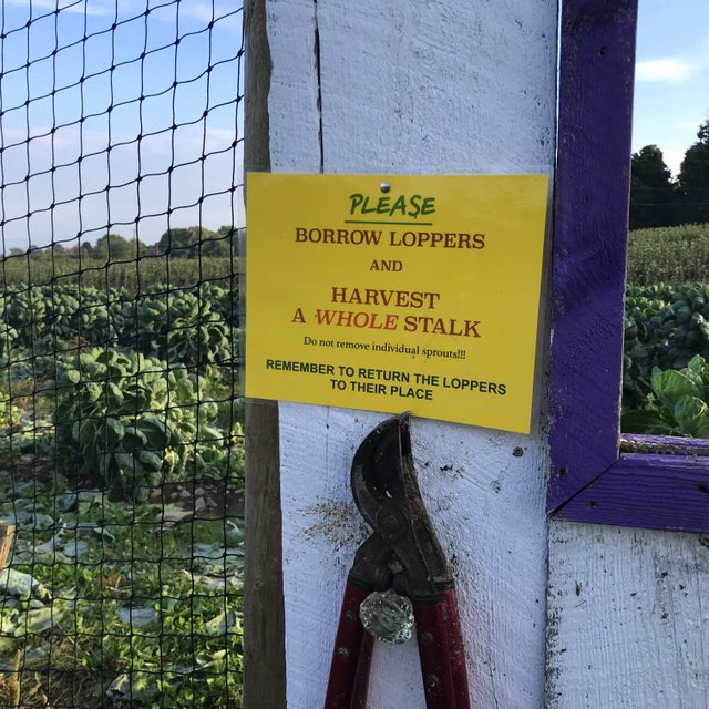 Another Power 1: pick your own Brussels Sprouts. Farmer Steve thanks you all for being such a polite and well-behaved crowd over the holiday weekend. In particular, you honored the Treaty of Brussels: (1) Find loppers at the Produce Portal which is a crystal-handled rickety door in the deer fence, (2) Find a deleafed stalk, meaning a stalk that had the leaves pre-stripped by a professional farmer, (3) Lop the whole stalk, (4) Return loppers to Produce Portal. DO NOT pick individual sprouts. Meaning do not pluck the l’il cabbages off the stalks. Take a whole stalk home then pluck the sprouts off right into your cookery. Then add bacon or facon.