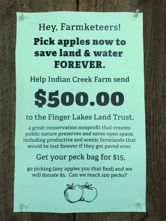 Poster #1 pretty much makes the case for apple picking on this cold weekend. Lands and waters don’t save themselves. People have to do it. (Because people are the messer-uppers.) If you pick a peck bag for $15, we will send $5 to Finger Lakes Land Trust. They protect gorges, forests, wetlands, and farmlands – including productive farms like Indian Creek that are lost forever if they get paved over. The legal instruments that the Land Trust uses to protect land ensure permanent protection. They are an accredited conservation nonprofit, indicating ethical conduct, sound finances, responsible governance, and lasting stewardship.