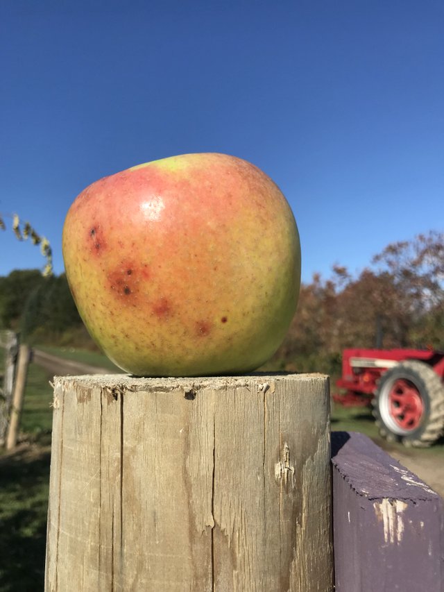 The apple orchard is beautiful this time of year. Some of the foliage is down and the booty is easy to spot. Not that kind of booty! Apples! Low-hanging fruit. Pomological plunder. You can pick gorgeous Spigolds (above) and Mutsus (below). Some people wait all year for these late-season beauties. Perfect for eating fresh and baking and saucing.