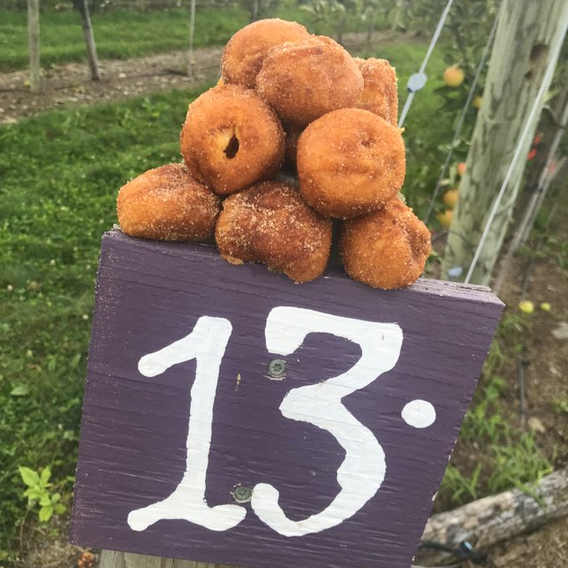 Fresh cider & cider donuts. Everyone is back to school and this topic is going to take some explaining. Okay here we go. There is fresh cider in our donuts, but if you want cider, you don’t have to squeeze it out of the donuts. You can just buy a half-gallon or one-gallon jug. That’s Part One of the lesson. Part Two: A baker’s dozen is 13, a farmer’s dozen is 14, but Nick the Donut Kid isn’t really a baker or farmer so he’s serving 12 donuts per dozen like a dozen is supposed to be. Just like Grandma said. Sometimes it takes a thoughtful teenager to bring things back to the Old Ways. If you find that your bag of donuts has one or two extra in the bottom, please count that as dumb luck and don’t get uppity and start thinking you deserve that bonus every time. Bonus donuts aren’t a right or a privilege – they’re a mistake. Our free advice is don’t get all high and mighty; because remember, the higher a monkey climbs the more he shows his BUTT. You can get your freshly fried toroids of fructotic splendor by the dozen or half-dozen between 10:30 and 6:00 on Saturday and Sunday. If you want cinnamon sugar, just whisper, “A sprinkle of SIN, SUGAR.”