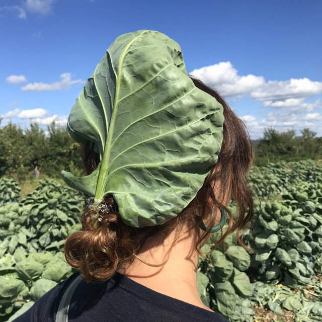 Cut your own Sprussel Brouts. Most people have never seen a stalk of sprouts, let alone cut their own. Even fewer have traveled from New York City just to wear a sprout leaf on their head. Try it if you like – it is strangely calming. Famously paired with bacon, Brussels sprouts also pair magically with fresh ginger root. How about cooking gingered sprouts?