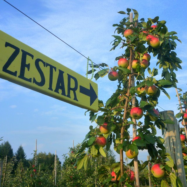 Pick Zestar apples! Most of you won’t feel the apple-picking spirit til September, but these are worthy early apples. Very pretty, round, rosy red apples. The flesh is juicy and crisp, with a sprightly zest (hence the name) that sweetens with caramel sugars. They store well for six to eight weeks, and are firm enough to please most bakers. Advanced apple data: Zestar comes from the breeding program at the University of Minnesota. It is a cross of State Fair and MN 1691 (Conell Red x Goodland), and it was released in 1999. “Zestar!” is the trademark name; the cultivar itself is called Minnewashta. How to avoid heartbreaking waste in apple season: Pick with 2 hands, steadying the branch and/or nearby apples with your non-dominant hand, then twist off your target apple with your best paw. Don’t let an apple fall, then knock another apple below, causing a chain reaction. Multiply that effect by thousands of pickers… and you got a defeated apple farmer. Please read our Farm School tutorial, How to Pick an Apple.