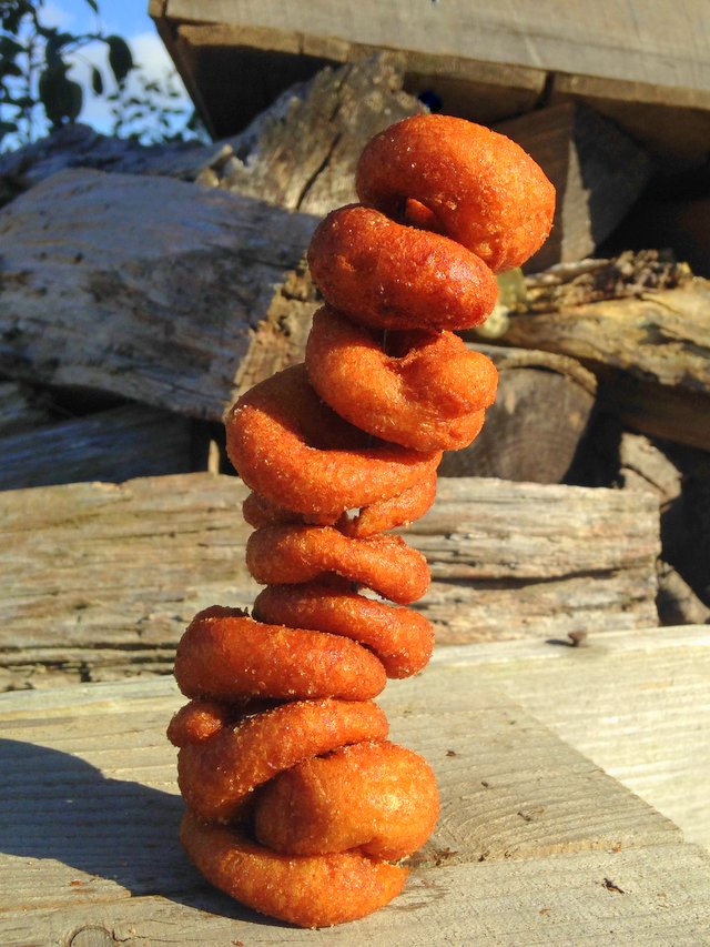 Get DONUTS every weekend. Donuts are rolling off the Mark 2 Donut Robot Friday, Saturday, and Sunday 11:00 to 6:00. Nick the Donut Kid is churning out these freshly fried toroids of fructotic splendor – optionally sprinkled with cinnamon sugar. Just whisper, “A sprinkle of SIN, SUGAR.” Pictured here with Honeycrisp.