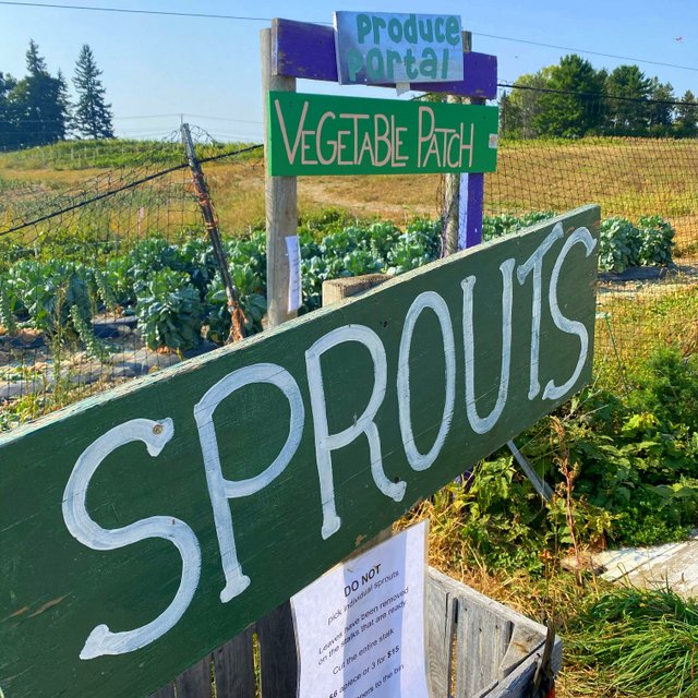 Cut your own Brussels sprouts. Also known as Sprussels brouts. Stirfry with bacon or fakin’ and feel the vitamins flow. In one of our best signage successes ever, you will find the sprouts in the patch marked “SPROUTS.” We have removed the leaves from the stalks that are ready. Cut the whole stalk; don’t pick individual sprouts since that wrecks the plant. Don’t be a plant wrecker. Be a sprout lover.