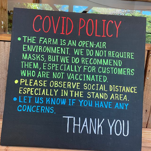 COVID status. Farm stand staff are fully vaccinated. Current protocols include: (1) The farm is an outdoor experience and we are not requiring masks, (2) We recommend that non-vaccinated people wear masks, (3) Practice social distancing inside the covered farm stand area (4) Note that these protocols could change throughout the season. Thank you.