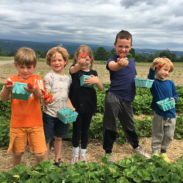 Everyone welcome • Open every day now through October • Current hours are 9:00 AM to 6:00 PM rain or shine • Pick your own strawberries or get prepicked quarts at the stand • Fresh garlic scapes • Lemon slushees • Fresh donuts Friday, Saturday and Sunday 11:00 AM to 5:00 PM • Local honey • Local syrup • Local pottery • Strawberries are sold by volume, not weight, so we provide containers for picking • COVID: Farm stand staff are fully vaccinated, and current protocols include: (1) The farm is an outdoor experience and we are not requiring masks, (2) We recommend that non-vaccinated people wear masks, (3) Practice social distancing inside the covered farm stand area (4) Note that these protocols could change throughout the season • Drive slowly on the farm • Thank you for supporting small farms and local artisans