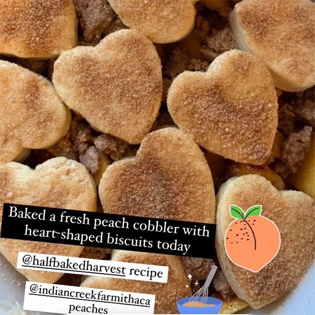 PEACH COBBLER = DROOL! Peach picking should start again soon! “Peach Time 🍑🍑 Love picking fruits for pies and dessert 😊 Always local 😊🍑 #indiancreekfarm #dolcedelight #ithacany #localfarmslocalfood“ Thank you for being SOOOO local, @dolcedelightithaca!