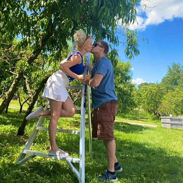 MODEL ORCHARD LADDER TECHNIQUE. (1) Remain on lower rungs, (2) Maintain a poised athletic posture, (3) Have trusted assistant stabilize ladder. Pictured are NYC-based singer-songwriter and bridal designer Jamie Burke and musician-actor Sean O’Shea. “We make an annual trip upstate to check out the farm! Fell in love with it!! Can’t get enough of those donuts heehee.” Thank you, @itsjamieburke!