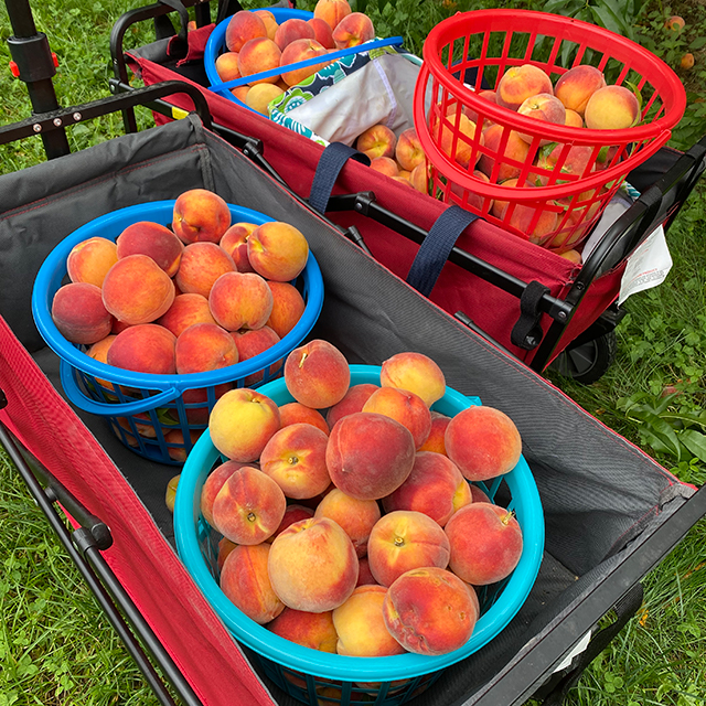 U-PICK PEACH SEASON = SHORT. It is a big and beautiful crop. But mind you, peaches will go POOF soon and the prime picking is now. Peaches are our most popular summer crop, so it’s best not to wait til you feel in the mood to mosey over here at your Bohemian leisure on a dappled sunny day. It would be best to come now, rain or shine. And remember! If you pick a peach that isn’t quite ripe, do not panic. Simply put the peach on your kitchen counter for a day or two. It will be great.