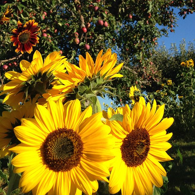U-pick pumpkins • U-pick apples including Mutsu, Splendour, Sir Prize, Northern Spy, Spigold, Prairie Spy, and others • U-pick sunflowers • U-pick Brussels sprouts • U-pick tomatoes • U-pick peppers • U-pick flowers • U-pick herbs • Open every day 8:00 AM to 7:00 PM rain or shine • Fresh donuts every day 11:00 AM to 5:00 PM including this Monday holiday • Shop for apples, pears, pumpkins, sprouts, squash, corn, garlic, ginger, turmeric, cider, honey, syrup, pottery, slushees, donuts, and more • COVID: Farm stand staff are vaccinated, and current protocols include: (1) We are not requiring masks as the farm is an outdoor experience, (2) We recommend that unvaccinated people wear masks, (3) Practice social distancing under the covered porch area, (4) These protocols could change • Drive slowly on the farm • Drive CAREFULLY when approaching and leaving the farm on Route 96 • Thank you for being kind when appropriate
