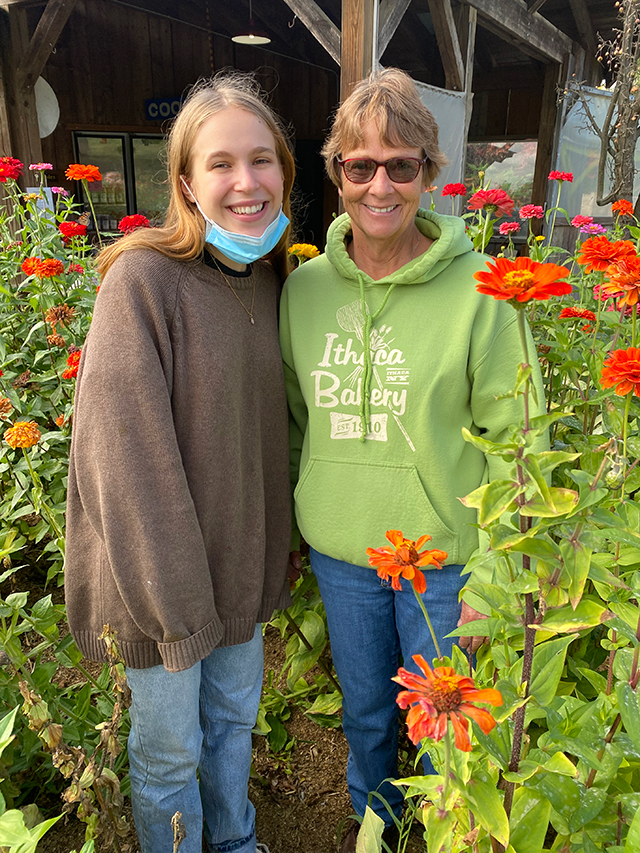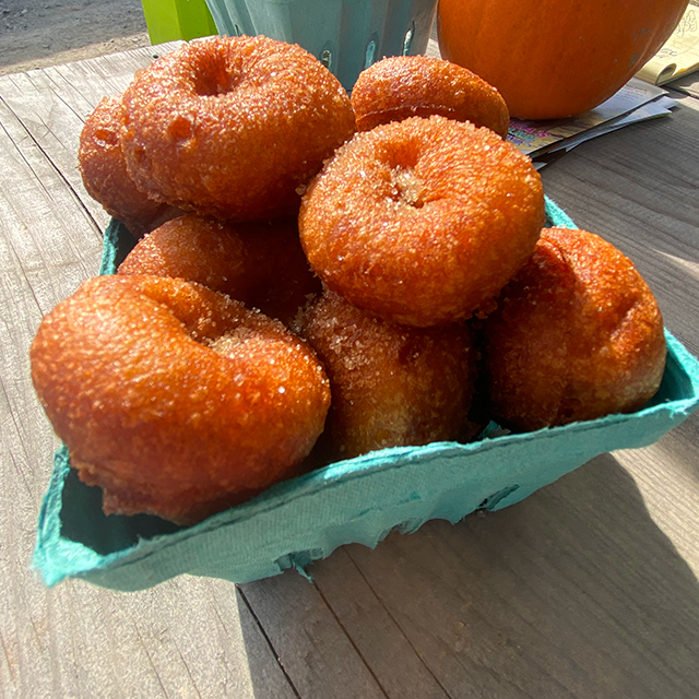 U-pick apples including Mutsu, Golden Russet, Newtown Pippin, Ashmeads Kernel • U-pick sunflowers • U-pick Brussels sprouts • U-pick tomatoes • U-pick peppers • U-pick eggplant • U-pick flowers • U-pick herbs • Open every day 8:00 AM to 7:00 PM rain or shine • Fresh donuts every day 11:00 AM to 5:00 PM except Monday • Shop for apples, pears, sprouts, eggplant, peppers, squash, corn, ginger, turmeric, cider, honey, syrup, pottery, slushees, donuts, and more • COVID: Farm stand staff are vaccinated, and current protocols include: (1) We are not requiring masks as the farm is an outdoor experience, (2) We recommend that unvaccinated people wear masks, (3) Practice social distancing under the covered porch area, (4) These protocols could change • Drive slowly on the farm • Drive CAREFULLY when approaching and leaving the farm on Route 96 • Thank you for being the best Farmkeeteers