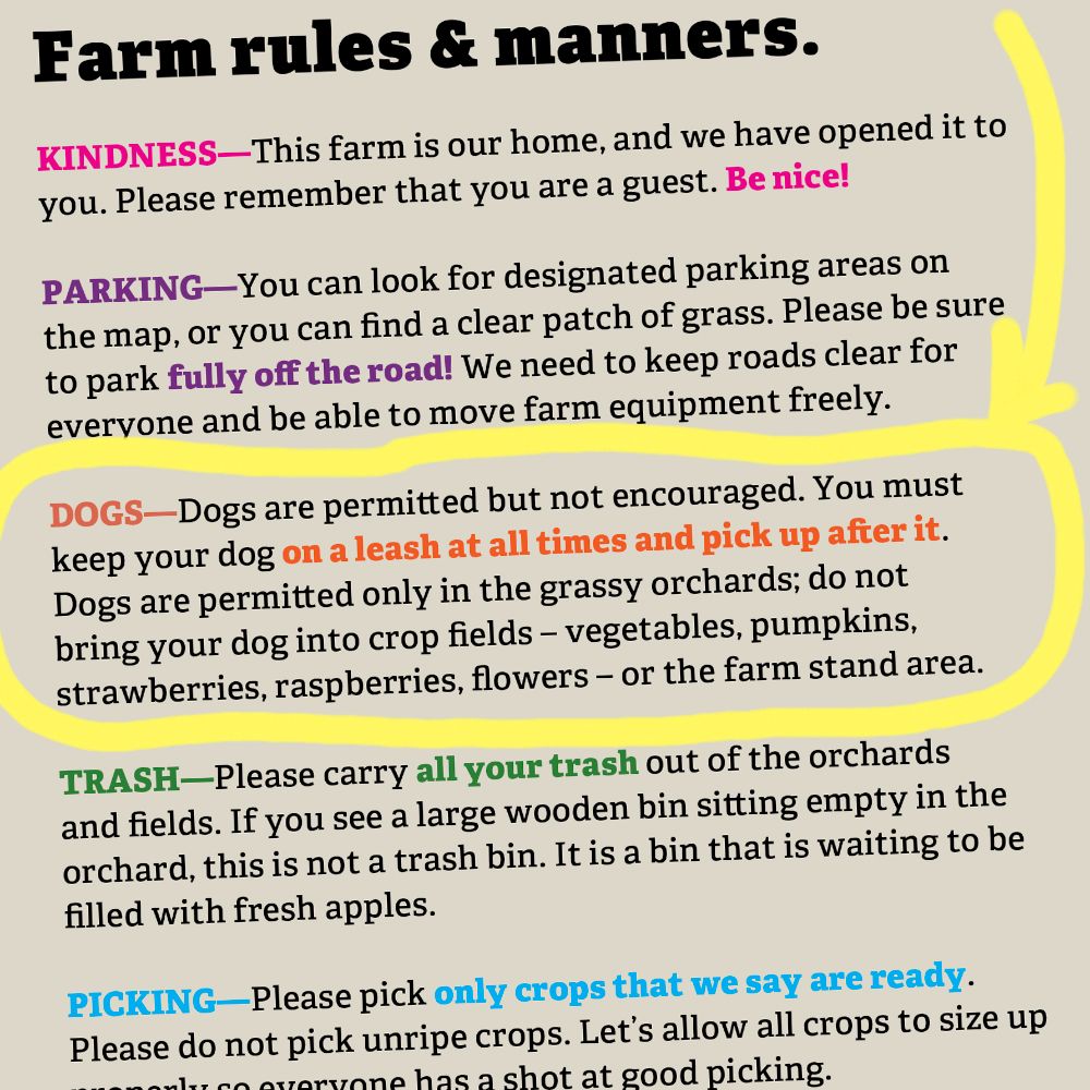 PLEASE UNDERSTAND THAT WE KNOW YOU LOVE YOUR FURRY HOUSE ELF. Best. Elf. Ever. But our updated policy is in pretty much everyone’s interest. It will be published in our 2022 Farm Guide in a couple weeks. Thank you very much for helping us keep the farm clean and safe.