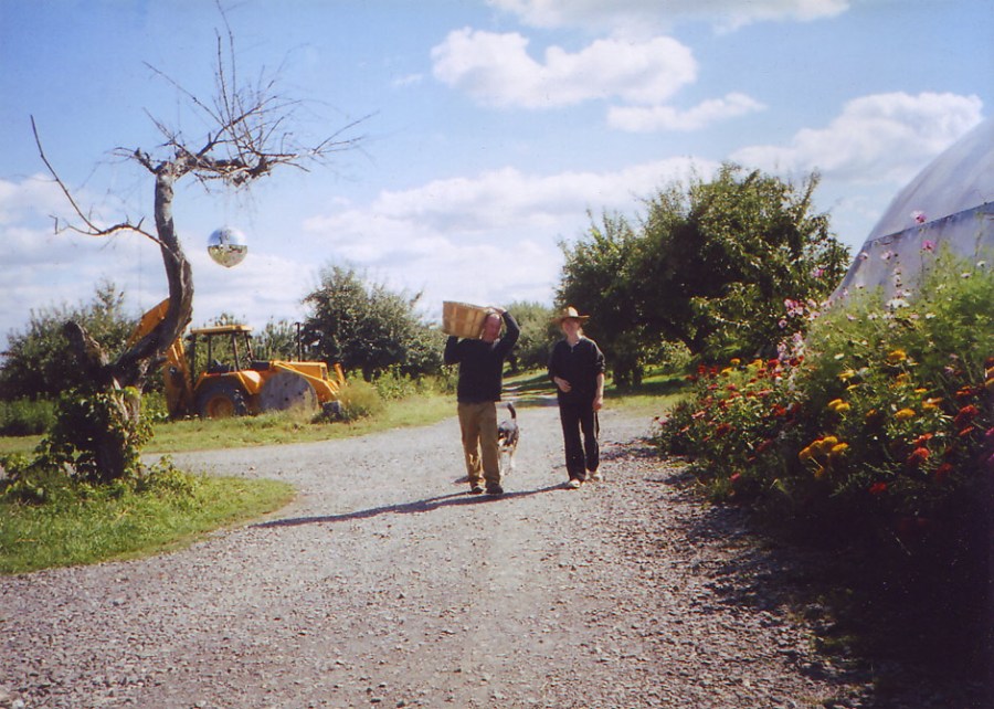 Farmer Stephen and Jen, The Farmer’s Wife; Balto, a bushel of apples, and a disco ball.