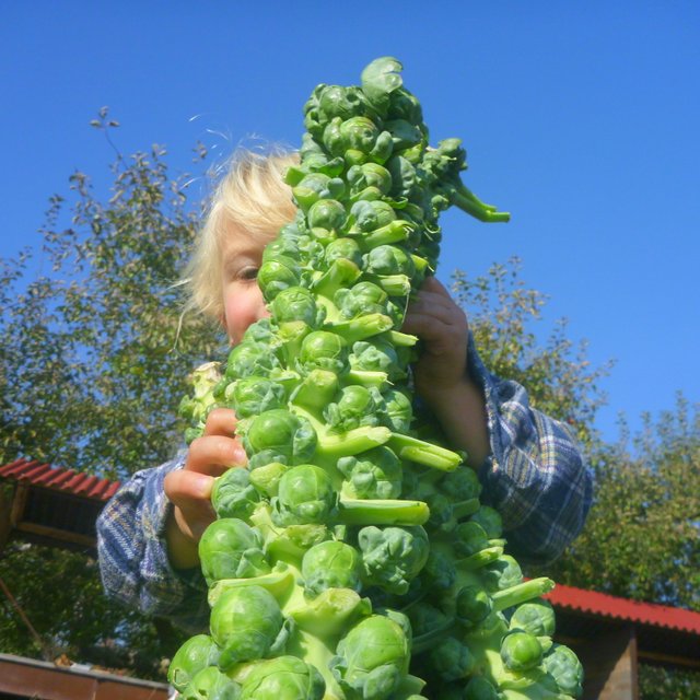 Cut your own Brussels sprouts. These massively nutritious spheroids of cruciferous crunchings are your best food-friend in late autumn. Cut a fresh stalk yourself, pop off the sprouts, chop in half, stir fry with bacon or facon. Please cut the whole stalk, not individual sprouts.