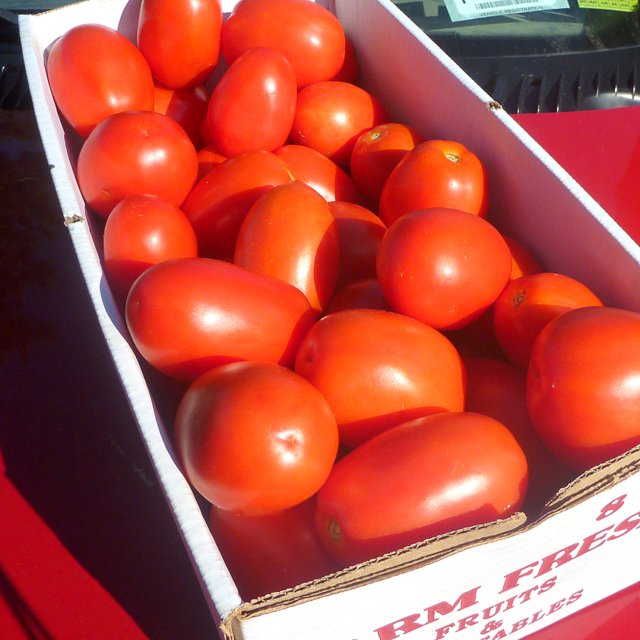 Last blast final Roma TOMATO canning/saucing sale! While supplies last, get Roma tomatoes in 25-pound boxes for $25 each, and peck boxes for $16 each. This sale is for prepicked (not u-pick) tomatoes. They come from Jackman Vineyards, our very next door neighbor. A fantastic deal as it ends up being cheaper than u-pick! Locavores, take action: time to “put up” (or shut up?!) for the winter.