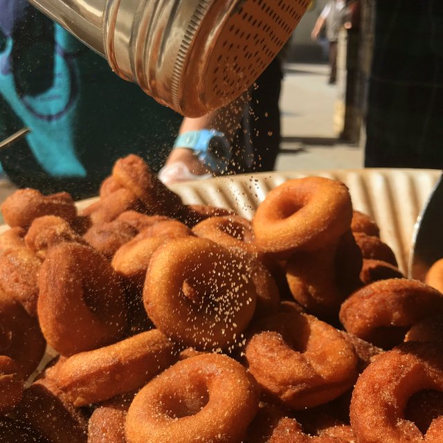 Get fresh cider donuts every weekend – including the holiday Monday 10/12/20. Donuts are rolling off the Mark 2 Donut Robot Friday, Saturday, Sunday, AND Monday 11:00 to 6:00. Nick the Donut Kid is churning out these freshly fried toroids of fructotic splendor – optionally sprinkled with cinnamon sugar. Just whisper, “A sprinkle of SIN, SUGAR.”