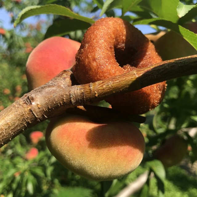 What have we done for you lately? Opened the donut peaches for u-picking. This is big news for you fanatics. You can expect the customary orchard bumrush when word gets out. It is first come, first git. Sorry, we cannot take reservations for these precious toroids of fructotic splendor. Pairing suggestion: Interlard your donut peaches with actual DONUT-donuts, served fresh and usually pretty warm every Saturday and Sunday 10 AM to 6 PM. Kabobs, anyone?