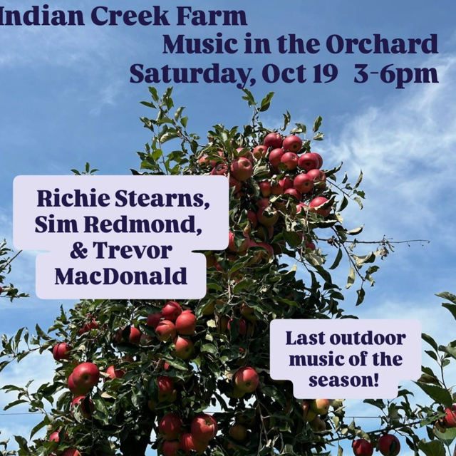 MUSIC IN THE ORCHARD: 3-6PM in the playground. Richie Stearns, Sim Redmond, Trevor MacDonald. FREE!!!