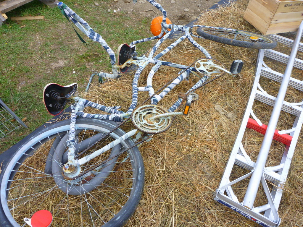 Tandem bike with pumpkin, ladder, crate, hay, inner tube.